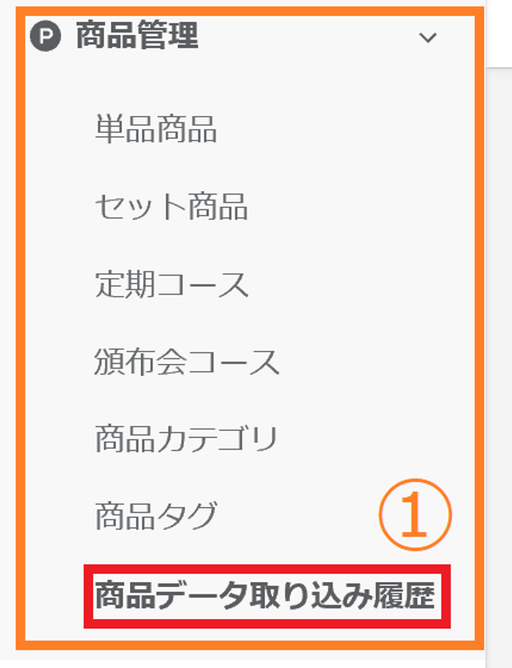 ①画面左のメニューバーより >【商品管理】>【商品データ取り込み履歴】をクリックしてください。