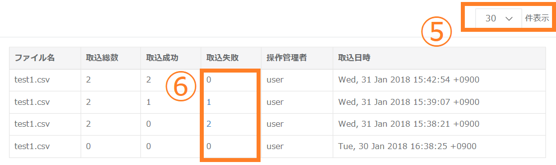 ⑥「取込失敗」の件数を確認してください。0件の場合は全て正しく取り込まれています。それ以外の場合は、正しく取り込まれていませんので、数字の箇所をクリックしてください。