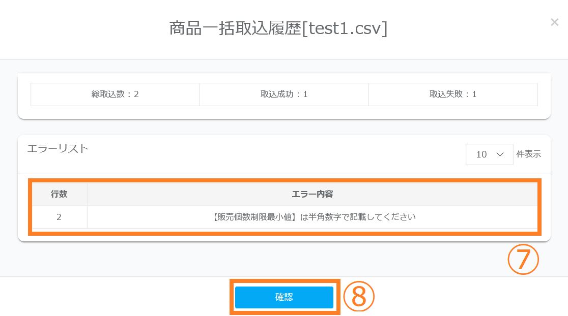 ⑦エラーが出ている情報の行数を「行数」でご確認いただき、「エラー内容」をもとに修正し、再度取り込み作業をしてください。