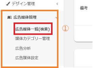 ①画面左のメニューバーより >【広告媒体管理】>【広告媒体一覧(検索)】をクリックしてください。