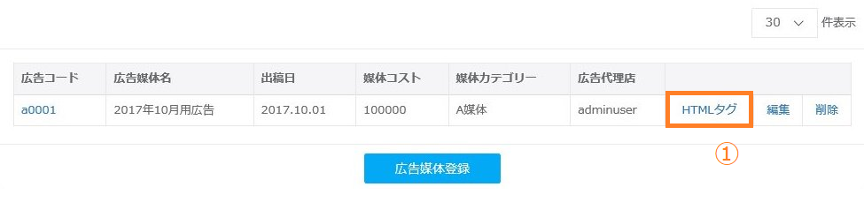 ①広告媒体一覧の画面より、タグを発行したい広告を検索し、「HTMLタグ」をクリックします。