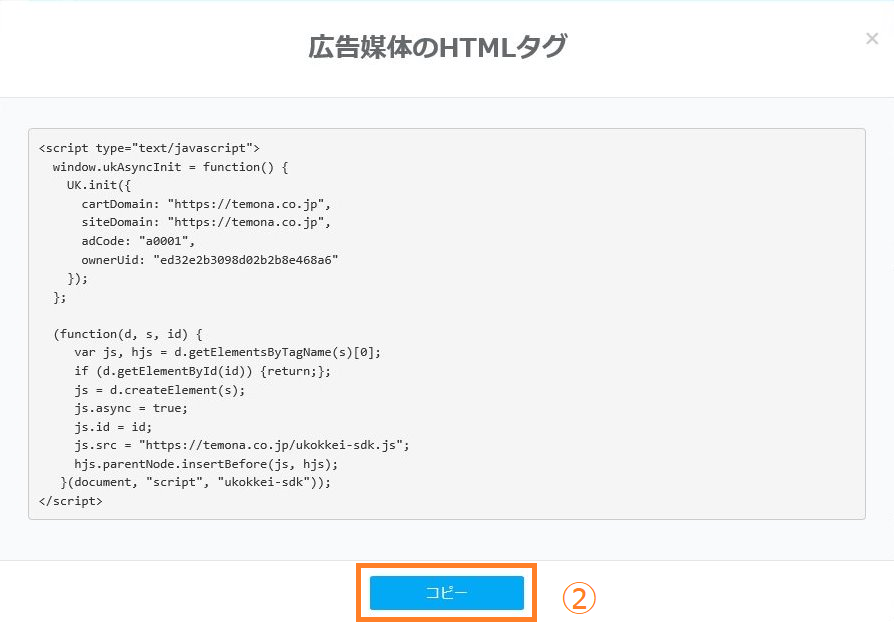 ②「コピー」ボタンをクリックするとHTMLタグがコピーできますので、対象ページにご設定ください。
